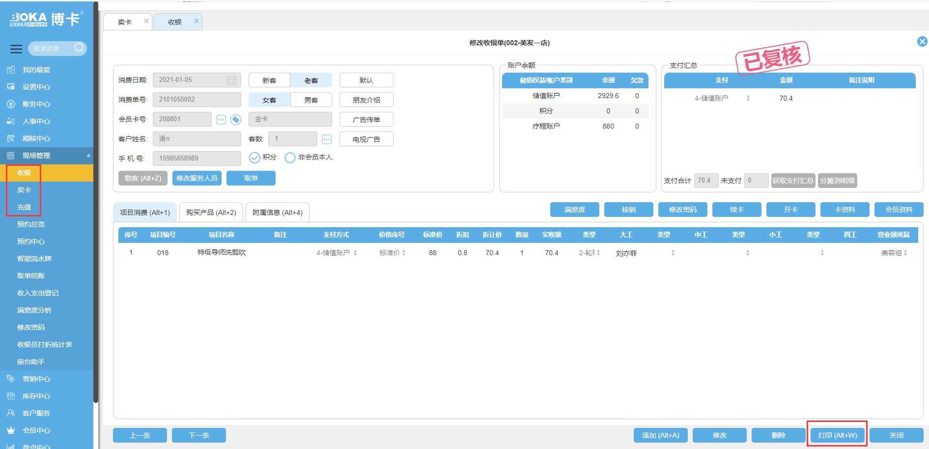 1. 点击“收银(卖卡、充值)”单据下方的打印按钮,弹出“打印设置”界面;