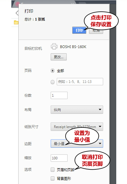 2. 在“打印设置”界面点击更多设置按钮展开更多设置,取消页眉页脚前面的勾选,点击打印按钮打印单据后完成设置。