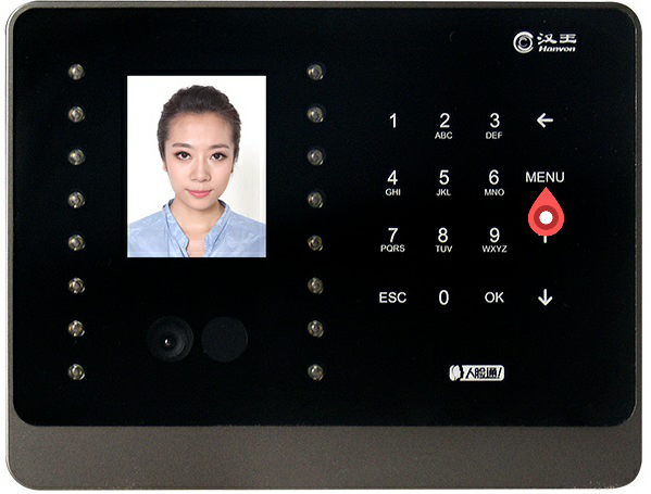 1. 在“博卡人脸考勤机”上点击“MENU“按钮,进入考勤机设置界面;