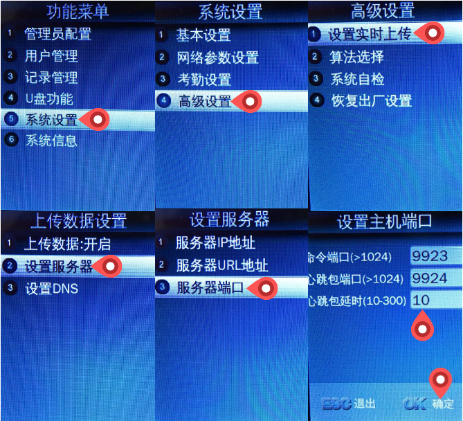5. 点击“系统设置-高级设置-设置实时上传-设置服务器”,设置“服务器端口”中:命令端口为“9923“,心跳包端口为“9924“,心跳包延时为“10“;