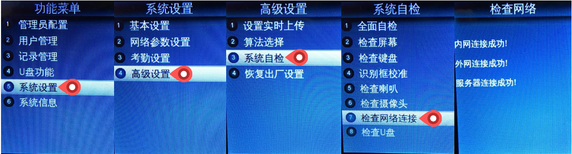 “博卡人脸考勤机”数据上传设置完毕后,点击“系统设置-高级设置-系统自检-检测网络连接“,系统提示“内网连接成功”、“外网连接成功”、“服务器连接成功”,则考勤机上传数据设置正常。
