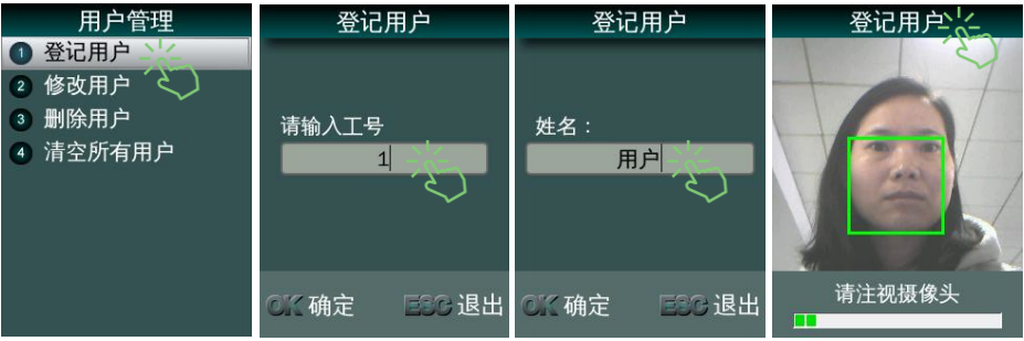 2. 点击“用户管理-登记用户“,输入员工编号,员工姓名,根据提示扫描员工面部数据,提示成功后新增员工完成。