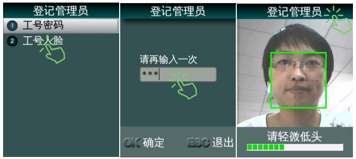 2. 选择工号人脸,录入“管理员人脸”后完成考勤机管理员设置,可以设置三个管理员。